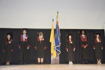 Под звуки студенческого гимна «Gaudeamus» выпускники, окончившие университет с «красным» дипломом, внесли в зал знамена ВГУ и ИМО. Затем с приветственными словами к выпускникам обратились проректор по контрольно-аналитической и административной работе Юрий Бубнов, директор Института международного образования ВГУ Владимир Родионов, а также деканы факультетов вуза, на которых обучались выпускники.
