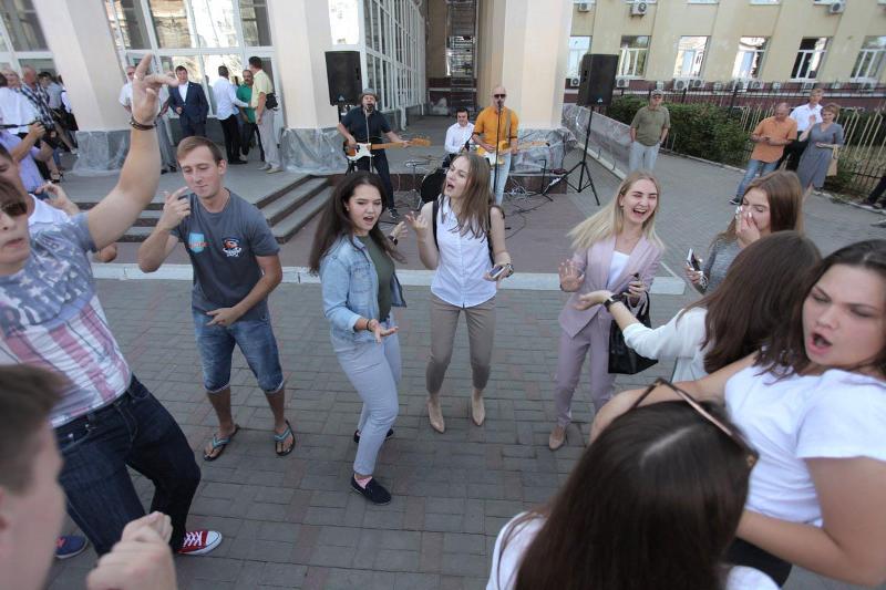 В Воронежском государственном университете новый учебный год начался по традиции ярко. Зажигательная музыка от кавер-бэнда Cover Brothers, танцы – вот она атмосфера настоящего праздника. Студенты также продолжили и традицию флешмобов, выстроившись перед входом в корпус в «надпись» #ВГУ.