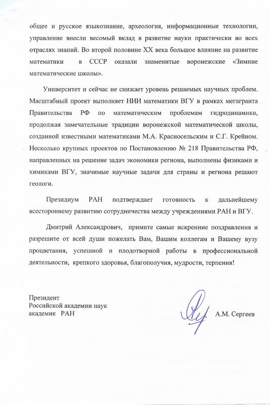 Президент Российской академии наук, академик РАН Александр Сергеев поздравил Воронежский государственный университет со 100-летним юбилеем.