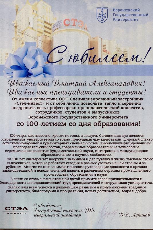 ВГУ 100 лет / Просмотров: 2461Генеральный директор ООО Специализированный застройщик «Стэл-инвест», заслуженный строитель РФ Валерий Лукинов поздравил ВГУ с вековым юбилеем.