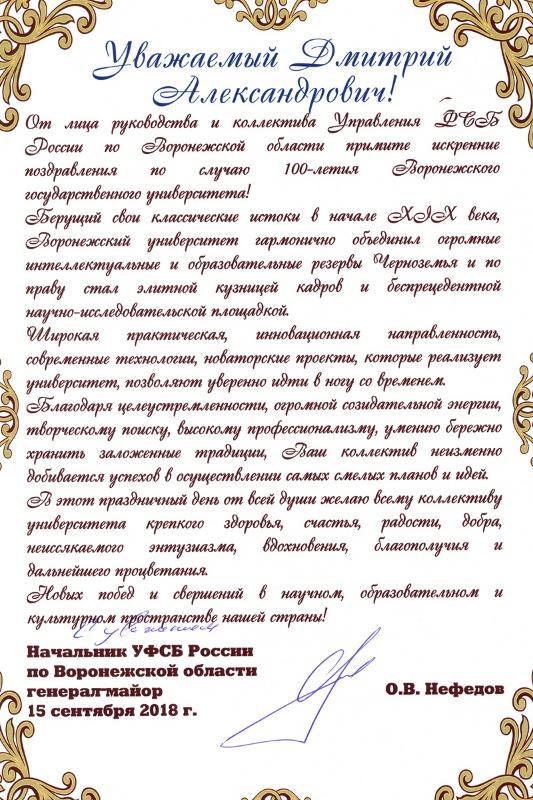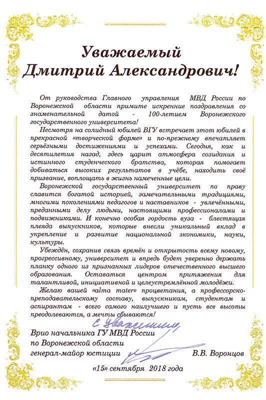 ВГУ со 100-летием поздравили врио начальника ГУ МВД России по Воронежской области генерал-майор юстиции Вячеслав Воронцов и начальник УФСБ России по Воронежской области генерал-майор Олег Нефедов.