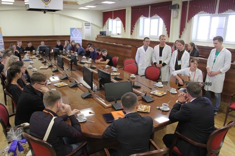 После открытия Турнира команды-участники лично встретились с ректором ВГУ. Они поздравили вуз со столетием и задали Дмитрию Александровичу интересующие их вопросы. Ректор рассказал о том, как в вузе осуществляется поддержка талантливой молодёжи, о формировании имиджа вуза в академической и бизнес-среде, а также о том, какие компетенции в настоящее время ценятся работодателями.