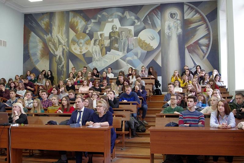 23 ноября в Воронежском государственном университете состоялась встреча студентов-волонтёров с представителями Ресурсного центра поддержки добровольчества в Воронежской области – руководителем регионального отделения Всероссийского общественного движения «Волонтеры Победы» Еленой Медведевой, советником генерального директора международного аэропорта «Воронеж» Ириной Чугуновой и коммерческим директором аэропорта Павлом Ковалевым. На встрече обсуждался Общенациональный конкурс «Великие имена России».