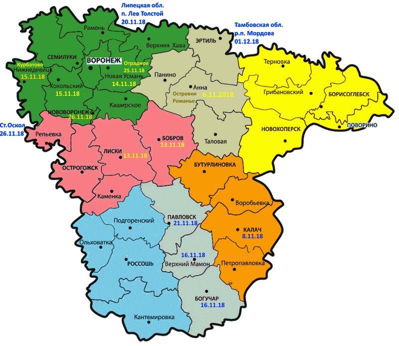 Научный «десант» был также отправлен в районы Воронежской, Липецкой, Тамбовской, Белгородской областей. Выезды учёных и аспирантов ВГУ состоялись в Нижнедевицкий, Хохольский, Бобровский, Панинский, Лискинский, Острогожский, Эртильский, Богучарский, Калачеевский, Павловский, Россошанский, Аннинский, Верхнемамонский, Новоусманский районы, город Нововоронеж, Старый Оскол, посёлки Лев Толстой, Мордово, Отрадное, Курбатово. Было охвачено 81 учебное заведение.