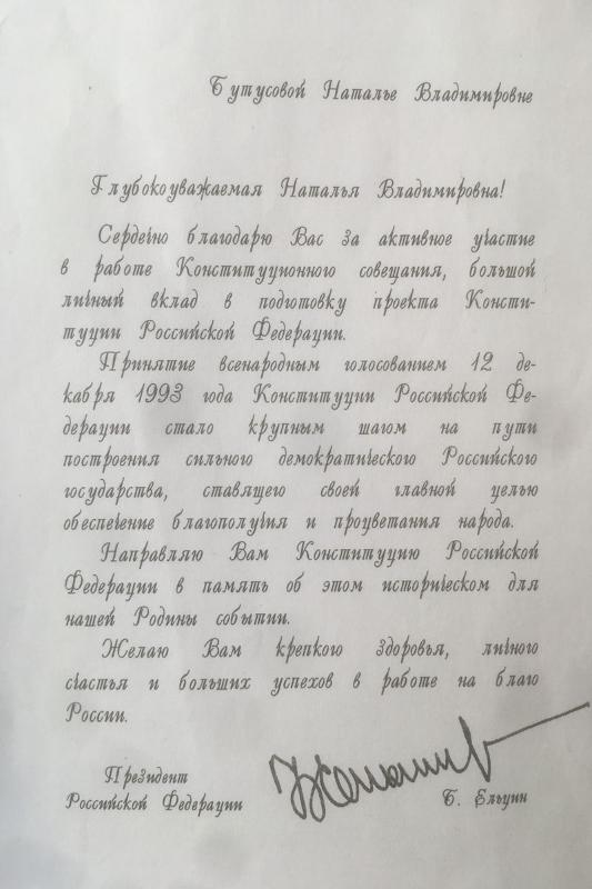 Профессор Наталия Бутусова принимала непосредственное активное участие в разработке действующей Конституции на всех этапах этого процесса – сначала неофициально, а затем на завершающих стадиях подготовки проекта Основного закона страны она была официальным представителем Воронежской области в Конституционной Комиссии и на Конституционном Совещании, созванном бывшим Президентом России Борисом Ельциным. Она поделилась своими воспоминаниями и мыслями о том, что в конституционном процессе было демократичным, а что недемократичным. Говоря о том, какие уроки мы должны извлечь из собственного прошлого, она подчеркнула, что конституция – безусловная важнейшая ценность демократического общества и государства, формализованный общественный договор о принципах государственного и общественного устройства. Но конституция является безусловной ценностью только тогда, когда ей подчинена политика государства. В результате приспособления Основного закона к политической конъюнктуре, конституция дискредитируется, утрачивает ценность документа, являющегося правовой и идеологической основой развития демократического общества и государства. Лектор на примере России пояснила к каким тяжелым последствиям для страны и народа это может привести.