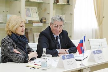 В ВГУ прошла рабочая встреча ректора университета Дмитрия Ендовицкого с президентом Международной комиссии MEDEF Филиппом Вербером. Собравшиеся обсудили международную образовательную программу ЕМВА, реализуемую ВГУ совместно и Высшим институтом коммерции Парижа, организационные вопросы церемонии вручения дипломов выпускникам второго набора, а также перспективы создания Научно-образовательного центра в Воронежской области.