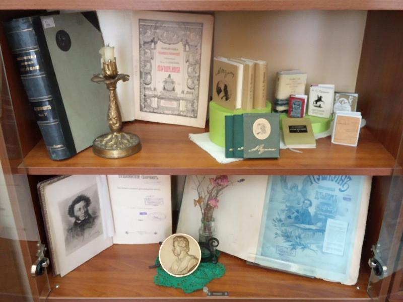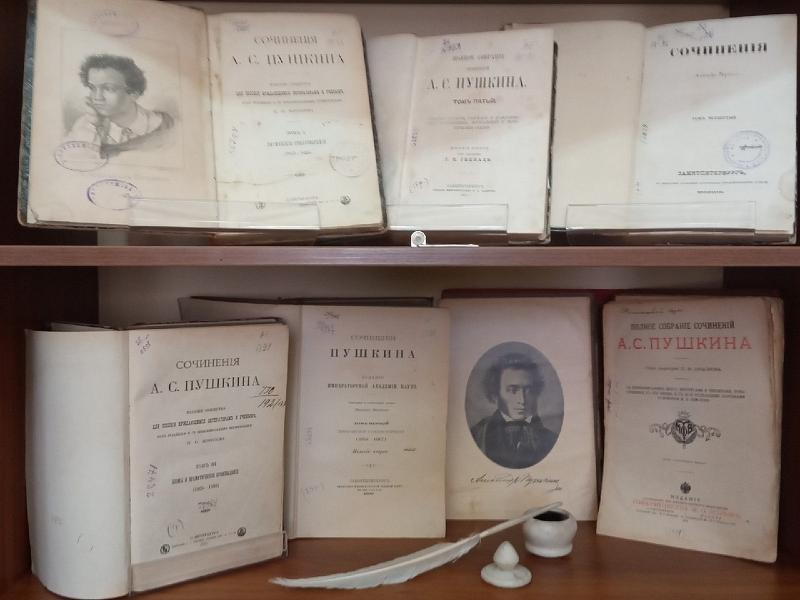 На выставке представлены: прижизненное издание «Стихотворения Александра Пушкина» (СПб., 1829), тома из полных собраний сочинений (1871–1914 годов выпуска). В серии «Библиотека великих писателей» под редакцией профессора С.А. Венгерова (Пг., 1915) опубликованы литературные статьи, представлено собрание писем А.С. Пушкина, дан ряд статей о последних днях жизни поэта.
