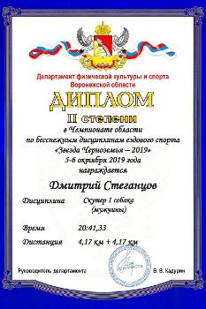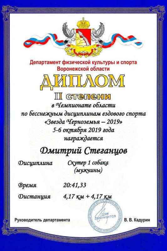 В самой скоростной и динамичной дисциплине «Велосипед 1 собака мужчины» занял первое место и стал чемпионом Воронежской области. В дисциплине «Скутер 1 собака мужчины» занял второе место в общем зачёте и первое место в зачёте собак северных ездовых пород. В дисциплине «Велосипед 2 собаки» занял второе место. Помимо этого, он принял участие в эстафете, состоящей из трёх этапов: каникросса (бега с собакой), скутера (скоростного самоката) и велосипеда.