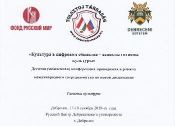 17–18 октября в городе Дебрецен (Венгрия) прошла международная конференция «Культура в цифровом обществе – аспекты гигиены культуры». Конференция была организована ассоциацией «За венгерско-российское сотрудничество имени Льва Николаевича Толстого», Русским Центром Дебреценского университета и фондом «Русский мир».