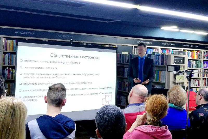 26 февраля в рамках проекта «BOOKSPACE» в книжном супермаркете «Амиталь на Пушкинской» состоялась публичная лекция на тему «Образ будущего России (по результатам экспертного опроса)», которую прочитал доцент кафедры социологии и политологии исторического факультета Воронежского государственного университета Денис Сосунов. Организатор встречи – ВРКПОО «Наша история».