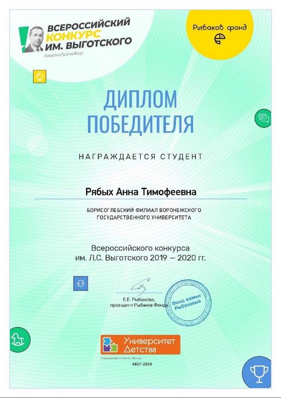 Студентка 5 курса технолого-педагогического факультета Борисоглебского филиала Воронежского государственного университета Анна Рябых стала победителем IV Всероссийского конкурса имени Л.С. Выготского, который проводится для педагогов дошкольного образования и студентов.
