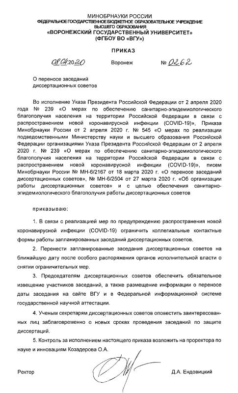В связи с реализацией мер по предупреждению распространения новой коронавирусной инфекции (C0VID-19), принимая во внимание, что защита диссертации проводится публично, руководством университета принято решение ограничить коллегиальные контактные формы работы диссертационных советов на базе Воронежского государственного университета с целью обеспечения санитарно-эпидемиологического благополучия участников заседаний.