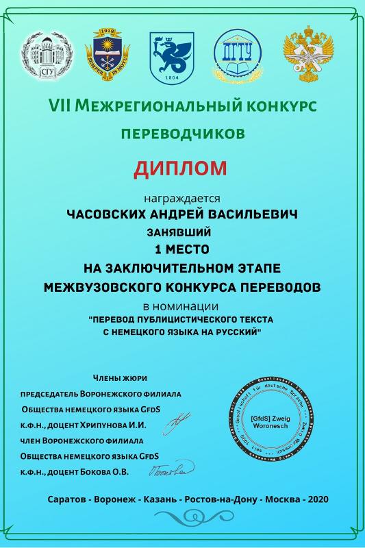 – Для меня это уже пятая попытка. Наконец, удалось занять первое место! Приступая к работе, я даже не думал о таком результате! Мне нужно было перевести статью с одного швейцарского портала о том, почему дети сегодня все позже и позже съезжают от родителей. Конкурсные задания всегда нелегкие, и этот текст не был исключением: чуть ли не каждый день в течение недели после окончания самого перевода я возвращался к тексту и вносил какие-либо правки. Всем участникам хочется пожелать, конечно, дальнейшего совершенствования в любимом деле! Выражаю огромную благодарность всем моим преподавателям за их титанический труд и за участие в моем профессиональном становлении, – отметил Андрей Часовских.