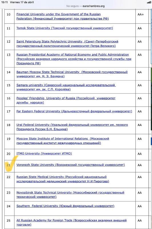 В этом году в рейтинге представлены и пять крупнейших высших учебных заведения Воронежа: ВГМУ им. Н.Н. Бурденко (36 место, категория А+), ВГТУ (38 место, категория А+), ВГПУ (132 место, категория ВВ+), ВГЛТУ им. Г.Ф. Морозова (189 место, категория В), ВГАУ имени императора Петра I (264 место, категория С+).