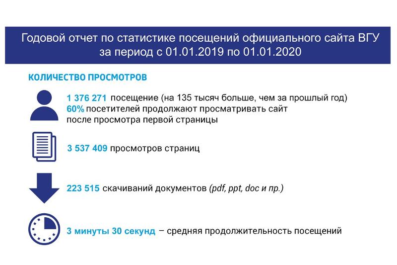 За год пользователи сайта 223 515 раз скачали документы, размещенные на сайте нашего вуза (что на 120 тысяч больше, чем в прошлом году). Чаще всего пользователи загружали файлы, касающиеся стоимости обучения, расписания занятий по факультетам, расписания занятий в аспирантуре, порядка заселения в общежитие, оказания платных услуг, а также книгу «Электронное обучение и дистанционные образовательные технологии в ВГУ».
