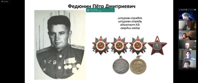 Более молодые преподаватели рассказывали о своих дедах. Так, дедушка Александры Антонишкис Петр Акулов за участие в Киевской операции получил Звезду Героя Советского Союза, дедушка Марианны Гафаровой гвардии майор Петр Федюнин был штурманом отряда, награжден целым рядом медалей и орденов.