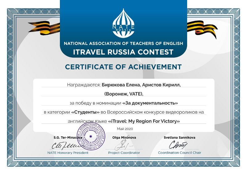Подведены итоги Всероссийского конкурса видеороликов на английском языке «iTravel:MyRegionForVictory». Он проводился Национальной Ассоциацией преподавателей английского языка и был посвящен 75-летию Победы в Великой Отечественной Войне. В творческом состязании приняли участие более 500 обучающихся школ и высших учебных заведений России.
