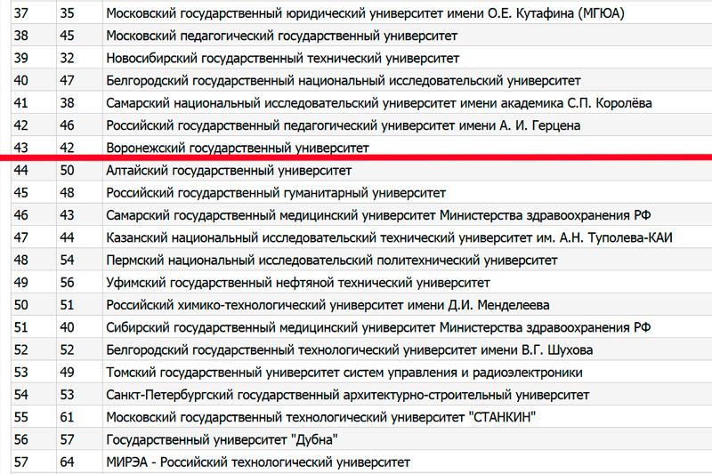 16 июня опубликован очередной рейтинг 100 лучших российских вузов по версии рейтингового агентства RAEX (Раэкс-Аналитика). В 2020 году Воронежский государственный университет занял 43 место.