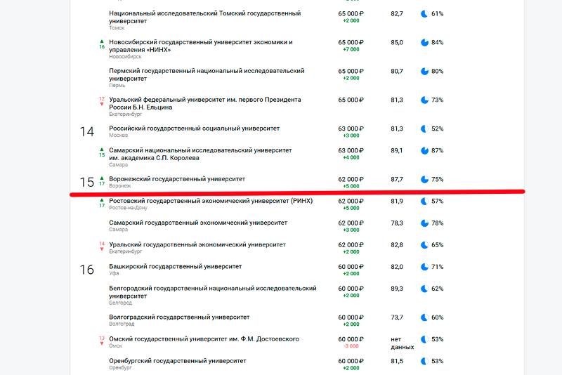 Выпускники экономического факультета поднялись с 17 на 15 место с уровнем зарплаты в 62 000 рублей. Молодые специалисты юридического факультета съехали с 9 на 10 место с уровнем зарплаты в 70 000 рублей.