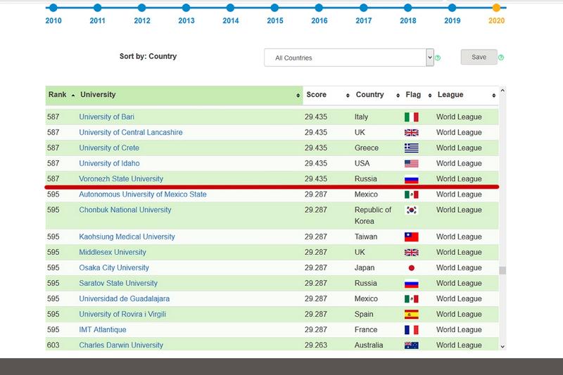 Воронежский государственный университет занял 587-е место среди 786-ти мировых университетов и 30-е место среди 81-го российского вуза. По сравнению с прошлым годом наш вуз улучшил свои позиции на 32 пункта.