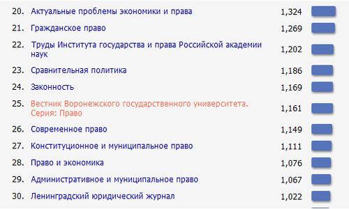 «Вестник Воронежского государственного университета. Серия: Право» (главный редактор Юрий Старилов) занял 25 строчку рейтинга среди 330 журналов правовой направленности. Журнал «Судебная власть и уголовный процесс» (главный редактор Денис Зотов) на основе 5-летнего анализа публикационной активности занял 110 место в рейтинге.