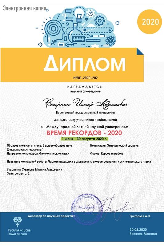 Она представила на универсиаду курсовую работу – исследование «Частотная лексика в словаре и языковом сознании носителя русского языка». Руководитель – профессор Иосиф Стернин.