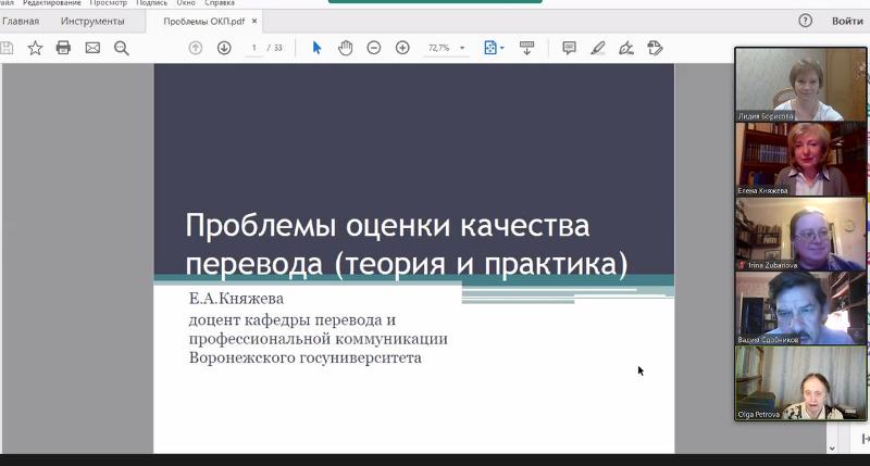 27 октября доцент факультета романо-германской филологии Воронежского госуниверситета Елена Княжева провела вебинар на тему «Проблемы оценки качества перевода». Дистанционную встречу организовала международная научно-исследовательская лаборатория «Теоретические и прикладные проблемы переводоведения», созданная в Нижегородском государственном лингвистическом университете им. Н.А. Добролюбова.