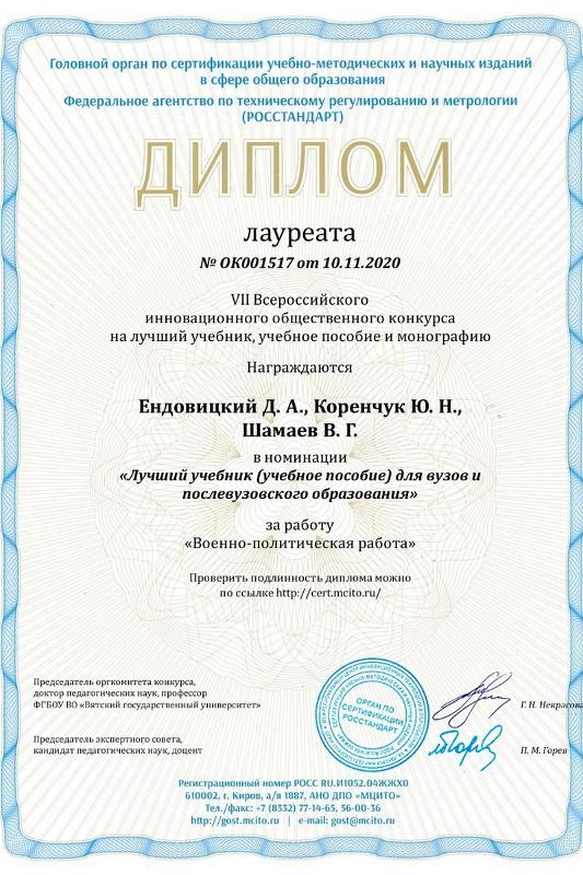Ректор ВГУ Дмитрий Ендовицкий, начальник ВУЦ ВГУ Юрий Коренчук и профессор ВУЦ ВГУ Виктор Шамаев стали лауреатами в номинации «Лучший учебник (учебное пособие) для вузов и послевузовского образования». Награду они получили учебник «Военно-политическая работа».