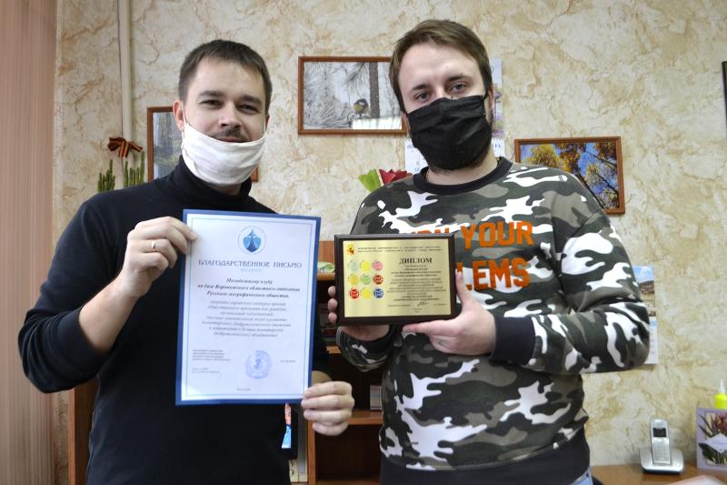 23 декабря были подведены итоги городского конкурса премий общественного признания для граждан, организаций, внёсших значительный вклад в развитие волонтёрского движения. Конкурс призван был выявить и поддержать наиболее активных представителей волонтёрского движения, молодёжных организаций, определить лучшие добровольческие практики на территории городского округа город Воронеж. По итогам конкурса молодёжный клуб Русского географического общества на базе Воронежского областного отделения Общества стал лауреатом в направлении «Лучшее волонтёрское (добровольческое) объединение».