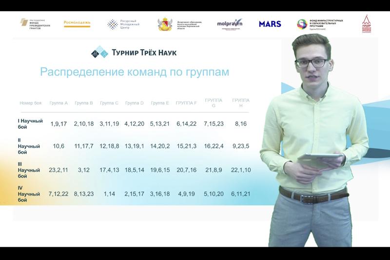 Турнир Трёх Наук – студенческое состязание, цель которого – создание площадки взаимодействия бизнеса и студенчества. Молодые учёные одновременно тренируются, применяя теоретические знания на практике, и находятся под наблюдением специалистов HR компаний-партнёров. Состязания проходят в формате научных боёв, где участвуют три стороны – докладчик, оппонент и рецензент. Их задача – найти оптимальное решение поставленных перед ними проблем, применяя знания сразу трёх наук – физики, химии и биологии. Молодые учёные исследуют проблему, ищут неточности в ответах соперников и пытаются усовершенствовать их решения. За ходом боёв наблюдает высококвалифицированное жюри, состоящее из учёных сферы естественных наук, а также представителей компаний-партнёров Турнира.