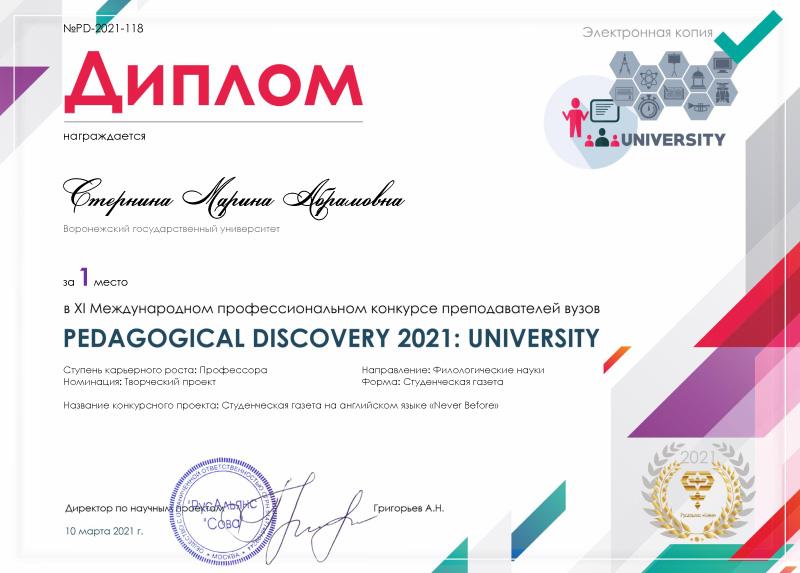 Профессор Марина Стернина также заняла первое место в номинации «Творческий проект». Экспертная комиссия высоко оценила представленную на конкурс студенческую газету на английском языке «Never Before». «Never Before» является приложением к газете «Воронежский университет» и выпускается с ноября 1996 года. Бессменным редактором этой единственной в России студенческой газеты на английском языке является профессор Марина Стернина.
