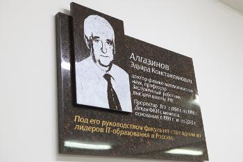 28 мая на факультете компьютерных наук установили памятную табличку профессору, доктору физико-математических наук, заведующему кафедрой информационных систем, декану факультета компьютерных наук, Эдуарду Константиновичу Алгазинову. На торжественном открытии присутствовали сотрудники, студенты и выпускники ВГУ. Ректор вуза Дмитрий Ендовицкий попросил присутствующих «выступать без слов печали».