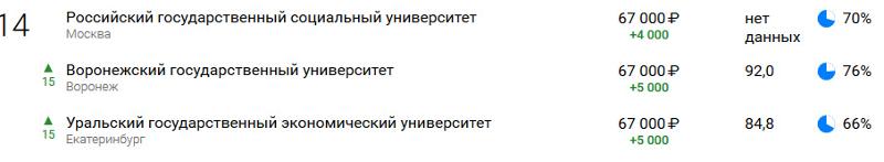 Выпускники ВГУ поднялись с 15-го на 14-е место с уровнем зарплаты в 67 тыс. рублей. Зарплата выросла за год на 5 000 рублей.