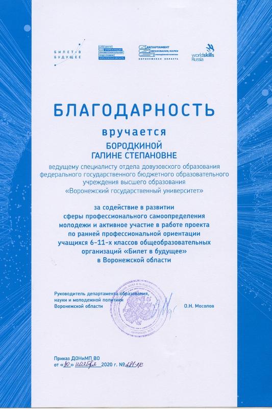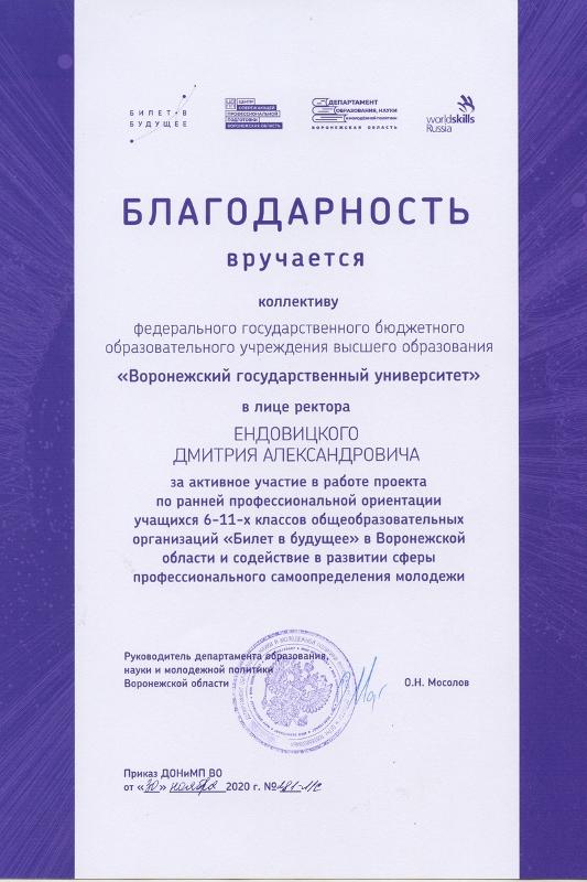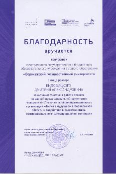Перед аудиторией выступила руководитель профориентационного центра ГАУ ДПО ВО «Центр опережающей профессиональной подготовки» Елена Медведева. В своём докладе спикер сообщила об актуальных федеральных и региональных профориентационных проектах, таких, как «Российское движение колледжей», «Формула хороших дел», «Большая перемена», «Перспектива» (совместно с Нефтехимической компанией «СИБУР Холдинг») и участии региона в их реализации. Специалист профориентационного центра Каролина Лавлинская привела подробную статистику проекта «Билет в будущее». В мероприятии, состоявшемся в формате видеоконференции, приняла участие куратор проекта «Билет в будущее» от ВГУ ведущий специалист отдела довузовского образования управления по довузовской работе и набору студентов Галина Бородкина.