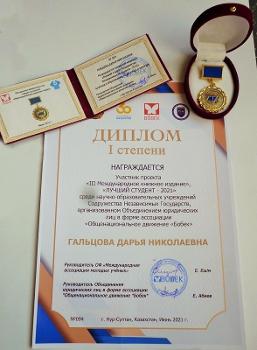 По итогам конкурса Дарья Гальцова получила диплом I степени и медаль «Лучший студент Содружества Независимых Государств – 2021». Сведения о научной деятельности студентки были внесены в III книжную коллекцию «Международная энциклопедия талантливой молодёжи “Лучший студент – 2021”». Научный руководитель Дарьи Гальцовой – профессор кафедры славянской филологии Вельмира Ивановна Дьякова, благодаря которой Дарья получила глубокую научную подготовку и неоднократно становилась победителем студенческих конкурсов разных уровней.