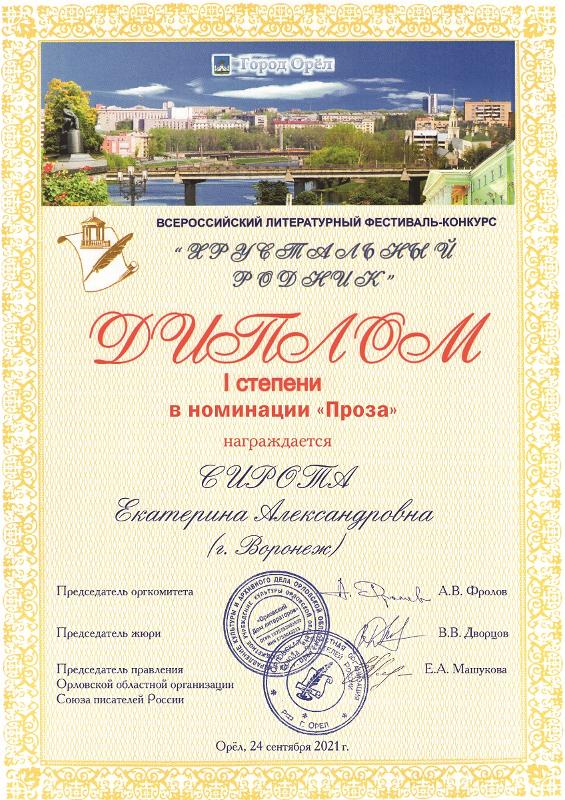 Доцент кафедры цифровых технологий факультета компьютерных наук ВГУ Екатерина Сирота заняла 1-е место в литературном конкурсе «Хрустальный родник», который имеет статус всероссийского и проводится ежегодно в Орле. В этом году конкурс состоялся в онлайн-формате.