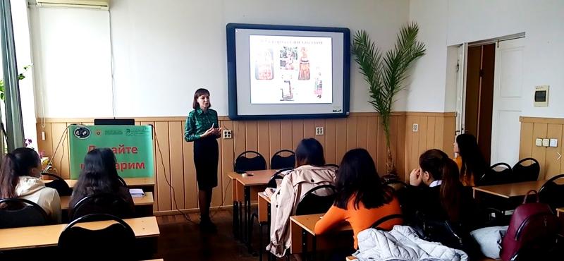 На втором занятии туркменские студенты погрузились в мир русского народного костюма. Они научились отличать сарафанный комплекс женской одежды от понёвного, узнали, что грибатка – это нагрудное украшение (а вовсе не блюдо из грибов), а также сравнили русский и туркменский народные костюмы. Интерес вызвала коллекционная кукла в наряде Воронежской губернии – на этом примере рассматривался южнорусский комплекс женской одежды.
