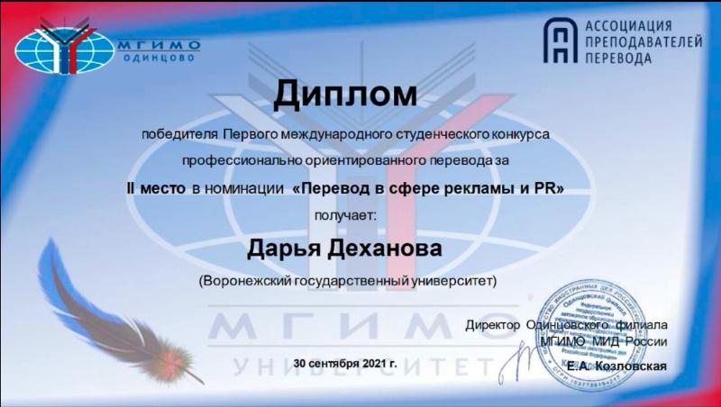 Студентки факультета РГФ ВГУ Дарья Деханова и Наталья Расторгуева победили в первом международном студенческом конкурсе профессионально-ориентированного перевода. Конкурс проводился 10–20 сентября. Организаторами выступили кафедра английского языка Одинцовского филиала МГИМО, Ассоциация преподавателей перевода, Минский государственный лингвистический университет, Ассоциация профессиональных переводчиков и профессиональных компаний Казахстана при поддержке Школы дидактики перевода Н.Н. Гавриленко.