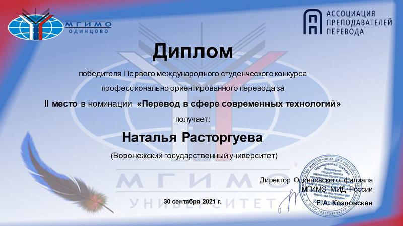 Студентка 3 курса Дарья Деханова, обучающаяся по специальности «Перевод и переводоведение», заняла 2-е место в номинации «Перевод в сфере рекламы и PR». Студентка 5 курса Наталья Расторгуева (специальность «Перевод и переводоведение») заняла 2-е место в номинации «Перевод в сфере современных технологий».