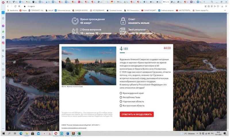 Географический диктант Русского географического общества прошёл в седьмой раз. Целью этой масштабной международной просветительской акции стали популяризация географических знаний и повышение интереса к географии России среди населения. В связи с пандемией формат диктанта по сравнению с прошлым годом изменился – организаторы предусмотрели три варианта его проведения: традиционный очный, дистанционный и онлайн.