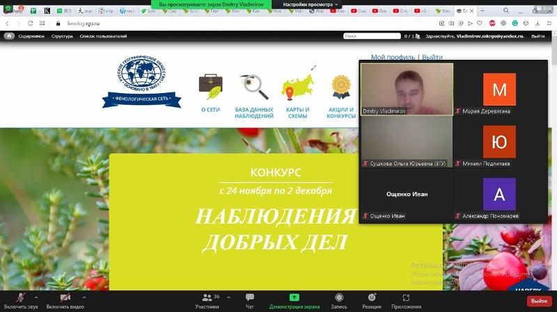 В первом семестре состоялось несколько лекций, проведённых в онлайн-режиме. Так, 27 ноября прошло выступление доцента кафедры рекреационной географии, страноведения и туризма Дмитрия Владимирова «Охраняемые природные территории Воронежской области. Охрана растений: вызовы и возможности». Слушателями лекции стали более 40 школьников и учителей Воронежской области. Дмитрий Владимиров охарактеризовал разные категории особо охраняемых природных территорий (ООПТ) региона, дал подробную характеристику некоторым из них, сделав акцент на территориях областного значения. В своём выступлении Дмитрий Владимиров также рассказал о набирающем популярность движении, которое принято называть гражданской наукой. Лектор продемонстрировал порядок работы с iNaturalist и Фенопорталом Русского географического общества (РГО) и призвал всех слушателей подключаться к проектам, реализуемых на базе этих платформ.