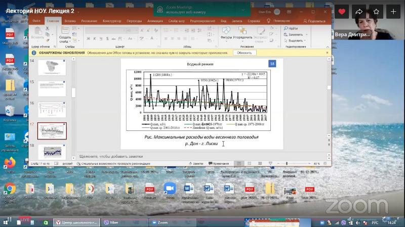 Доктор географических наук, профессор кафедры природопользования Вера Дмитриева провела 4 декабря лекцию «Современный режим рек. Климатические вызовы – гидрологический отклик». Вера Дмитриева подробно охарактеризовала гидрологические особенности рек бассейна Верхнего Дона, проследила их тесную связь с климатическими изменениями.
