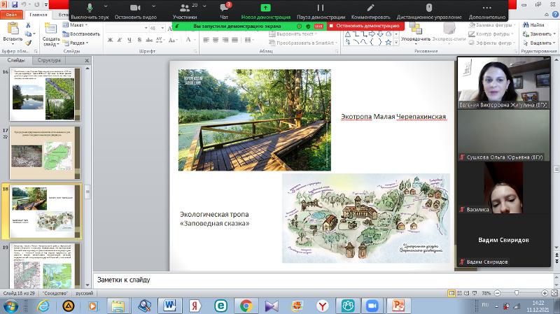 Доцент кафедры физической географии и оптимизации ландшафта Евгения Жигулина представила лекцию «Рекреационное значение ООПТ для Воронежской области». Особое внимание лектор обратила на возможности исследования разных категорий охраняемых территорий региона с помощью современных дистанционных методов.
