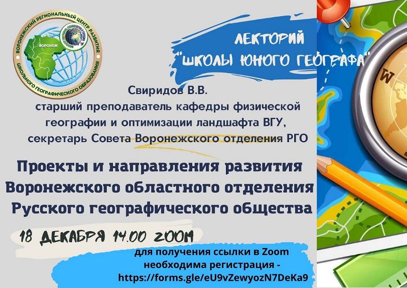 На факультете географии, геоэкологии и туризма ВГУ продолжает работу лекторий «Школа юного географа», действующий под эгидой Воронежского регионального центра развития школьного географического образования. Работу курирует заместитель декана по довузовской работе, доцент кафедры социально-экономической географии и регионоведения Ольга Сушкова,информационно-организационную поддержку осуществляют преподаватель кафедры социально-экономической географии и регионоведения Мария Деревягина и старший преподаватель кафедры физической географии и оптимизации ландшафта Вадим Свиридов.