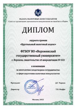 ВГУ удостоился премии «Хрустальный налоговый кодекс» в номинации «За многолетнее плодотворное сотрудничество в сфере подготовки налоговых консультантов». Вуз вошёл в число 50 номинантов-партнёров, членов Наблюдательного совета, образовательных организаций, удостоенных премии.