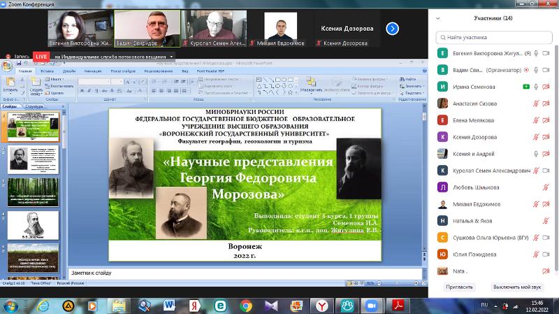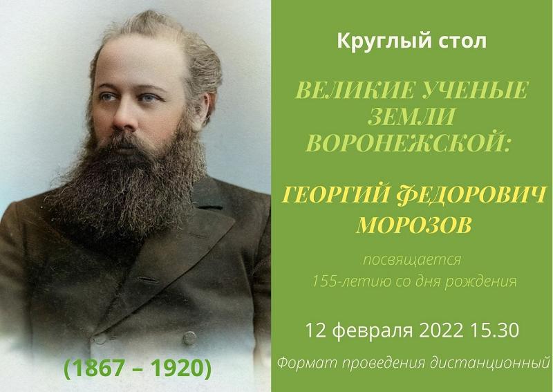 12 февраля в рамках работы краеведческого научного студенческого кружка факультета географии, геоэкологии и туризма ВГУ прошло заседание круглого стола Воронежского областного отделения Русского географического общества «Великие учёные земли воронежской: Георгий Фёдорович Морозов». Встреча была посвящена 155-летию со дня рождения известного русского лесовода-географа. Заседание было инициировано Воронежским региональным центром развития школьного географического образования.