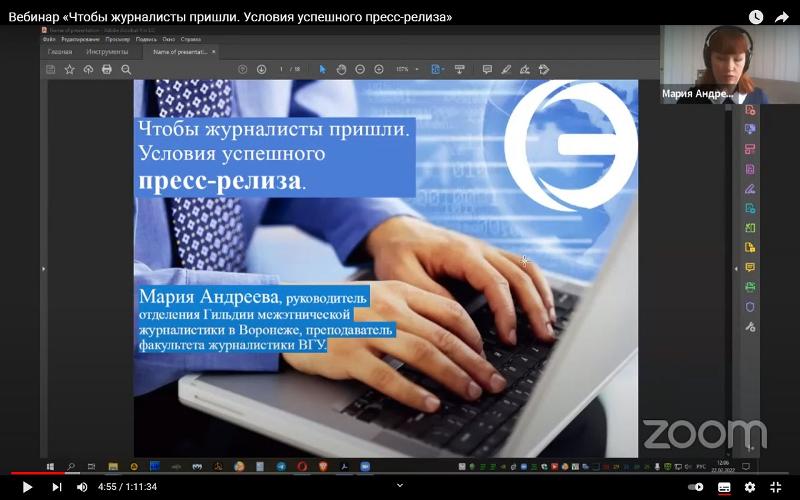 Вебинар «Чтобы журналисты пришли. Условия успешного пресс-релиза» провела 22 февраля преподаватель факультета журналистики ВГУ, руководитель отделения Гильдии межэтнической журналистики Мария Андреева. Слушателями стали представители общественных организаций (прежде всего в сфере межнациональных отношений и культуры) из разных регионов страны – Москвы, Санкт-Петербурга, Красноярского края, Татарстана, Приморского края и др. Мария Андреева рассказала о том, как важно взглянуть на мероприятие или проект с точки зрения журналиста, о том, как именно это сделать, на что обратить внимание, отбирая информацию для сообщения. Большая часть вебинара была посвящена правилам составления пресс-релиза – его структуре и языку.