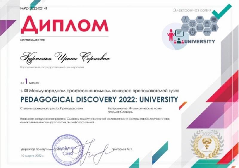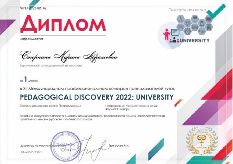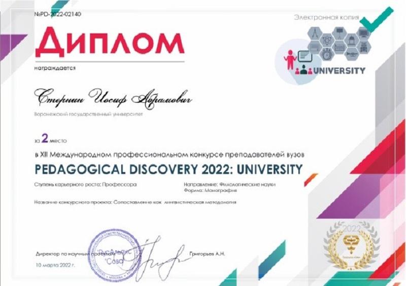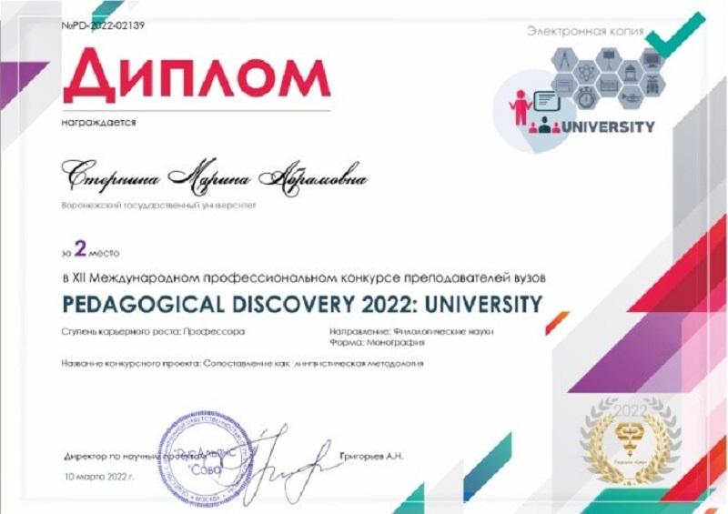 Филологи ВГУ стали победителями XII международного профессионального конкурса преподавателей вузов «Pedagogical Discovery 2022: University». Жюри отметило монографию профессоров Марины Стерниной и Иосифа Стернина «Сопоставление как лингвистическая методология» (Воронеж: «Ритм», 2021).