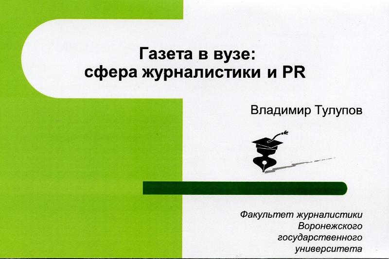 Декан факультета журналистики ВГУ профессор Владимир Тулупов подготовил и издал брошюру «Газета в вузе: сфера журналистики и PR». Она призвана оказать помощь редакторам и активистам вузовских многотиражных газет, которым принадлежит важная роль в формировании общественного мнения в коллективах преподавателей, сотрудников и студентов.