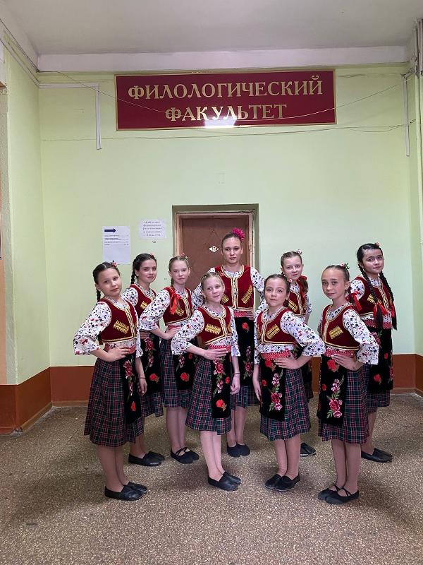 Дети из творческого центра – танцуют. В сербских народных костюмах, бело-красных, похожие на цветочную россыпь.